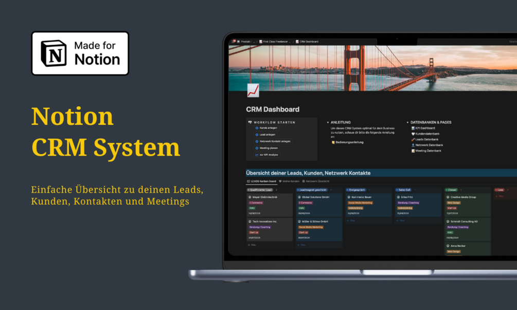 Gut! Dann habe ich hier die perfekte Ergänzung für deinen Notion Workspace! Mit meinem Notion CRM System kannst du ganz einfach Leads, Kunden, Kontakte und Meetings verwalten.